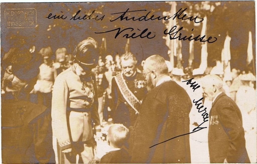 Igen, ez itt I. Ferenc József Innsbruckban, abban a városban, ahol annak idején Sissivel megismerkedett. A felvétel 1909 augusztus 29-én készült, és nem rögzít világpolitikai jelentőségű eseményt. A császár éppen nem üzen hadat senkinek, mindössze egy szőke kisfiút vesz szemügyre, akitől vélhetően azt kérdezi: „- Na, és mi leszel, ha nagy leszel?”A képeslap nem hagy kétséget afelől, hogy a címzett – ezúttal: Dada – számára a német nyelvnek sem voltak rejtelmei. A német szónak egyébként is nagy hagyománya lehetett az Albrizzi – családban, elvégre a grófi címet I. Ferenc osztrák császárnak köszönhették.