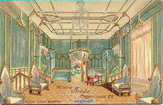Írásom aktualitását, mint sejthető, az adja, hogy egy külhoni aukciós ház kínálatában a Maison Frida néven elhíresült „műintézmény” két reklám-képeslapjára bukkantam, és honfiúi felbuzdulástól vezérelve hazatessékeltem őket, annak ellenére, hogy ugyanazt a szalonbelsőt ábrázolják. A lapok egyike megőrizte ártatlanságát…..
