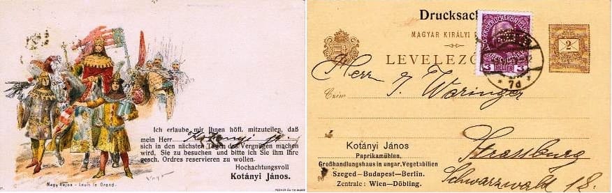A képeslap, ha jól értelmezem, ifj. Kotányi rövidesen bekövetkező látogatására készíti fel strasbourgi címzettjét. Azt azért el kell ismerni, hogy Nagy Lajos kiválasztása jó ómennek bizonyult, mert a Kotányi-cég ismertsége mára túllépte annak a bizonyos „három tenger mosta” területnek a határait.