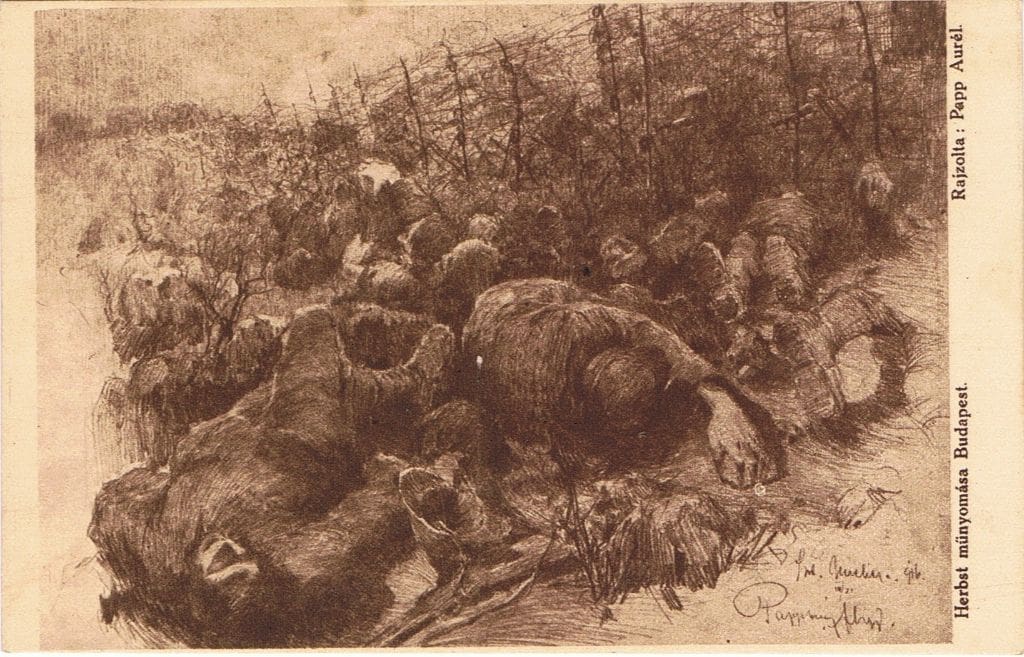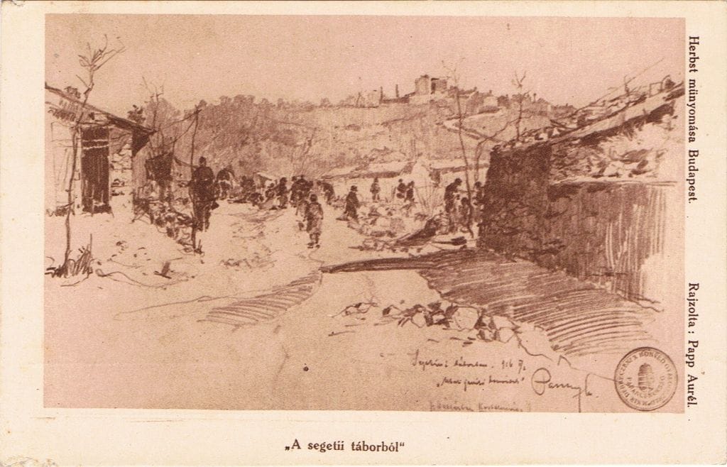 Papp (Popp) Aurél (1879- 1960) nevét a szakmán-, gyűjtőkön kívül alig ismeri valaki Magyarországon. Romániában élt, és alkotott, ott is a perifériára szorulva, egyrészt földrajzilag (Szatmárnémetiben), másrészt magyar-előzményei-, és kötődései miatt marginalizálódva. Jómagam, festői munkásságát – főművek szintjén – ismertem, összegyűjtött írásait könyvtáramban őrzöm. Persze, tudtam Adyhoz fűződő barátságáról is. De nem ezért döntöttem a képeslapok megszerzése mellett. Papp Aurél munkáiban nem érzek semmit azokból a zavaró tényezőkből, amiket felsoroltam. Rajzai egy nagy művész, egy hiteles ember őszinte-, már-már képregényszerűen összefűzhető tudósításai a háború valóságáról: