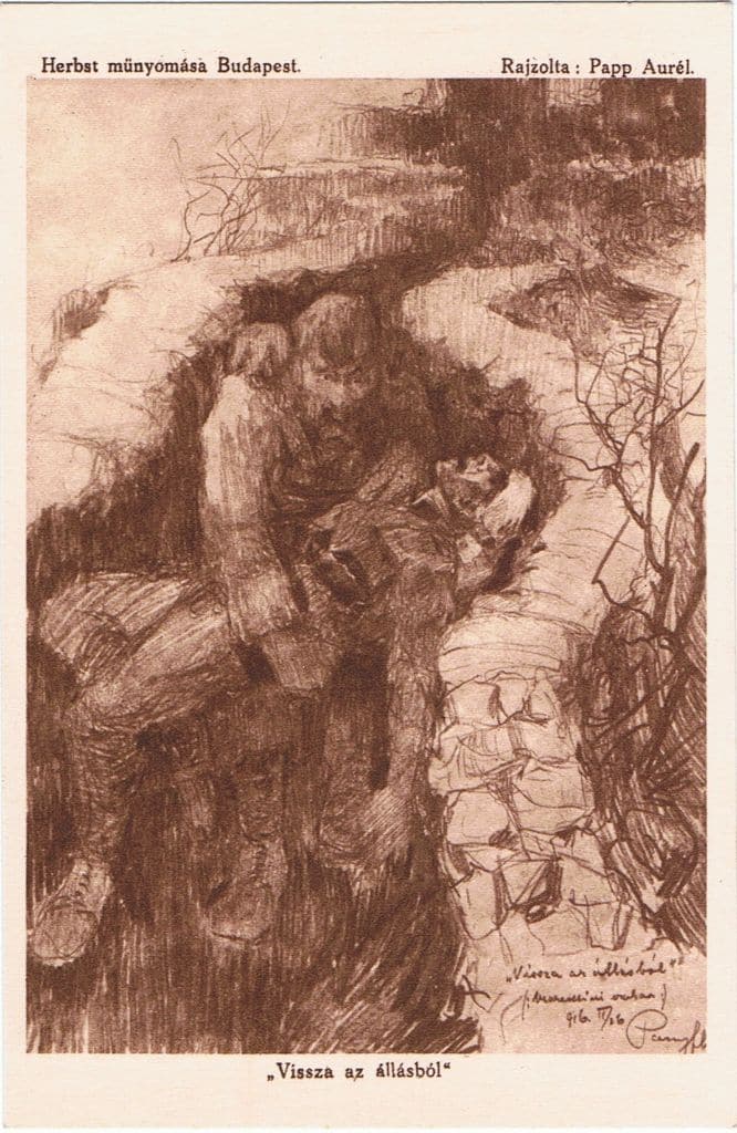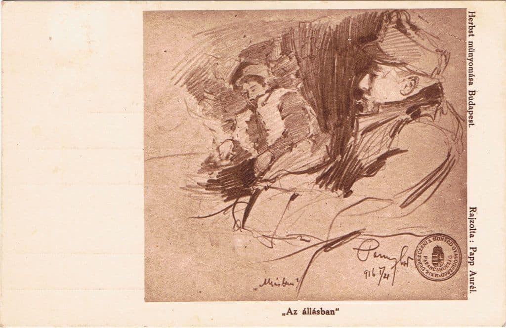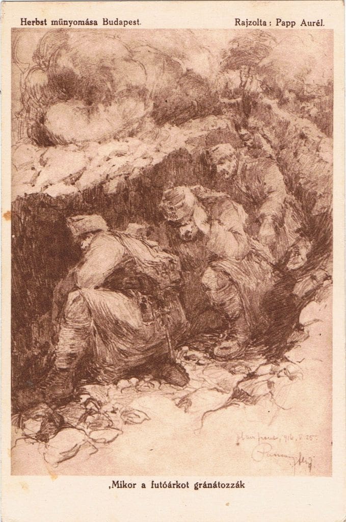 A gyűjtők „gondviselője” rendezhette úgy a dolgokat, hogy az első világháború kitörésének századik évfordulójára, a világháló jóvoltából, rábukkanjak Papp Aurél tábori képeslap-sorozatára. Bevallom, egy darabig csak kóstolgattam, kerülgettem a lapokat, végül mégiscsak lecsaptam rájuk. Hezitálásomnak egyszerű oka volt: a háborús tematikától mindig is idegenkedtem, a propaganda-célú felhasználás – a hazug „lövészárok- romantika” – vagy a frontkatonákat célba vevő reklámlapok cinizmusa miatt. A felsorolt jellemzőktől a műfaj legtöbbre tartott alkotásait – pl. Alberto Martini „Danza Macabra Europea”-sorozatát, vagy Carl Otto Czeschka-, és Ludwig Hohlwein lapjait – sem érzem mentesnek…