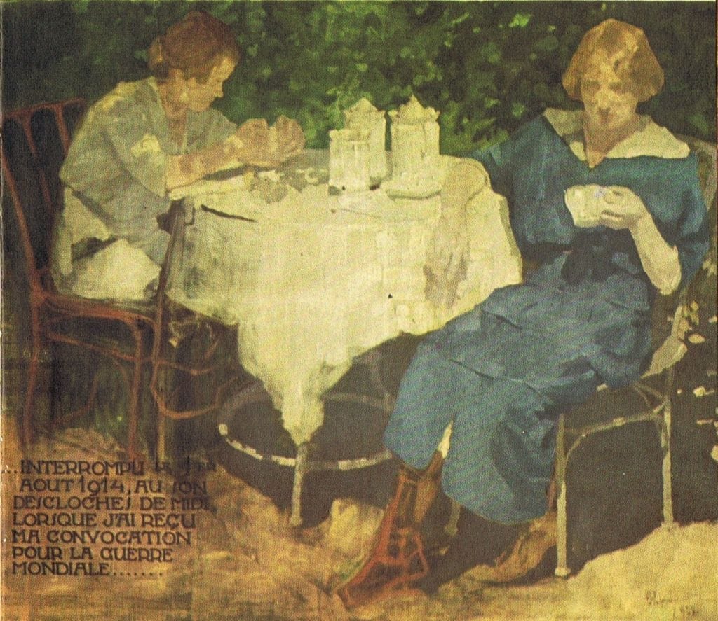 „Félbehagyva 1914. augusztus 1-jén, a déli harangszóra, amikor megkaptam behívómat a világháborúba”.