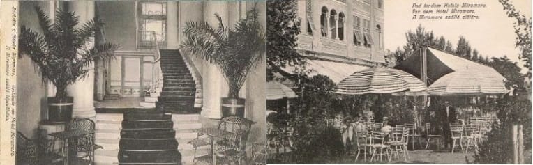 Most már bevallhatom, hogy nem a képeslapok terelték figyelmemet a szállodára, hanem pont fordítva volt: a szálló tette érdekessé a képeslapokat, különösen amióta tudom, hogy az épület ifj. Rimanóczy Kálmán műve (tervezés & kivitelezés), azé az építészé, akinek olyan épületek őrzik az emlékét, mint az ikonikus nagyváradi Városháza, a jobb sorsra érdemes, szintén nagyváradi Moskovits palota, vagy a debreceni Takarékpénztár (ma: Művelődési Központ) épülete. A Miramare gyógyszálló, amelyet legkedvesebb munkájának tekintett, 1905-re készülhetett el (találkoztam az 1908-as évszámmal is, de én Máli 1906-ból való képeslapjainak hiszek!), és arról a kortárs szemtanú, Nagy Márton, így lelkendezett: