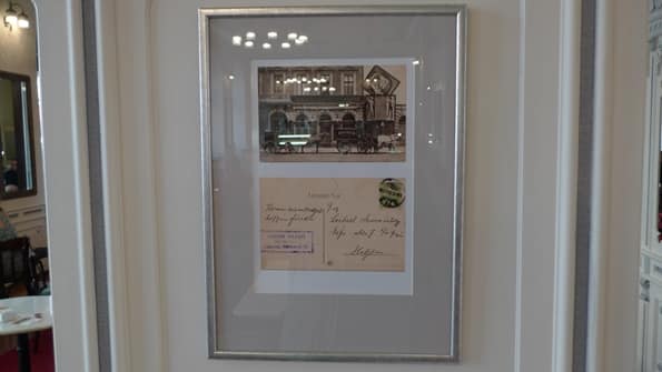 Hát, igen, egy kicsit ódivatú, egy kicsit lila, de… Hauer! Amikor először megpillantottam, izgatott lettem, mert stílusa alapján XIX. század véginek néztem, de az alaposabb szemrevételezés kijózanított: ez a reklámlap bizony 1911-ben, vagy utána hagyta el a nyomdát. Némiképp meglepő, de ennek a képeslapnak volt egy korszerűbb, fotómontázs-szerű előzménye, ami ki is van állítva a cukrászdában, néhány más Hauer-relikviával együtt: