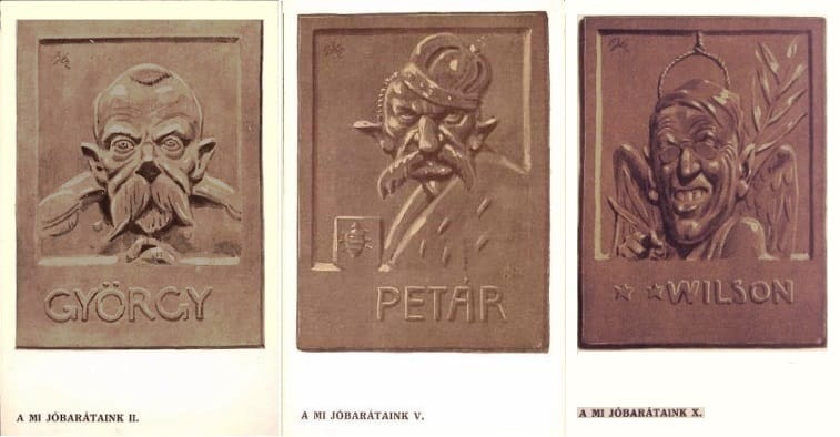 Az ellenség főembereiről – királyokról, politikusokról – készült gúnyrajzok a háború „érettebb” szakaszának termékei, valószínűleg 1916-ból. „A mi jóbarátaink” sorozatcímet a kiadó malíciának szánhatta, másként nem értelmezhető a dolog, hiszen az ábrázolt személyek a Monarchia ellenségeit képviselték. Válogatás a tíz lapos sorozatból: