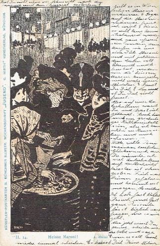 A gesztenyeárus asszonysághoz sikerült hamarosan a másik képeslapot is társítanom, amivel igencsak összeillenek, hiszen a művész emlékeiben is élő városligeti korcsolyapálya elképzelhetetlen volt gesztenyeárusok nélkül: