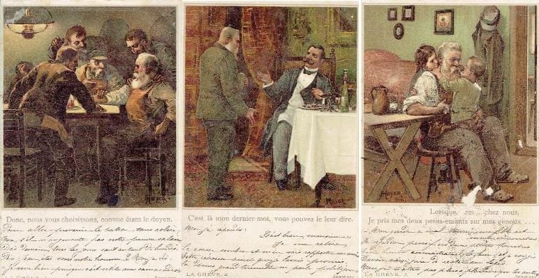 Ezzel meg is érkeztünk ahhoz a műfajhoz, amelynek Heyer buzgó művelője lett, annak rövidesen bekövetkező elvirágzásáig: a képeslapokhoz. Termékeny alkotó volt, de szikár kinézetű, színtakarékos lapjaival, amelyeket korábban nem átallottam „alsópolcosoknak” nevezni, nem sikerült a műfaj nagyjai közé kerülnie. Igazából nem is szeretnék sok szót fecsérelni rájuk, elég nagy számban vannak jelen a nemzetközi kínálatban, bárki által fellelhetők. Van azonban egy meglehetősen rendhagyó, ritka, és általam első látásra munkásmozgalminak vélt képeslevelezőlap-sorozata, amely az évek során elég sok fejtörést okozott, leginkább azért, mert csak távolról, és részleteiben ismerhettem. A „La grève” (Sztrájk) – című sorozatról van szó, és a fejtörést az okozta, hogy a képregényszerű alkotásról nem tudtam eldönteni, hogy az Heyer szociális érzékenységének eredménye-e, vagy csak egy történet rendelésre készült illusztrálása? Most, hogy sikerült a teljes sorozatot megszerezni, sok minden kiderült róla, így már képes vagyok eredményekről is beszámolni.