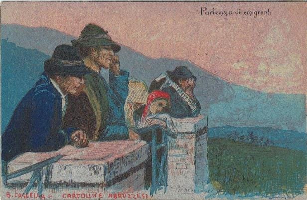 A képeslap címe – „Partenza di emigranti” (Kivándorlók indulása) – kétséget sem hagy a felől, hogy a művész egy Olaszországot erősen sújtó jelenség illusztrálására vállalkozott, olyanéra, mint amilyentől mi sem voltunk mentesek, hiszen Fiume kikötőjében is egymást érték akkortájt a kivándorlóhajók. Ami ezen az ábrázoláson leginkább megragadott, az a színpadiasság teljes hiánya: a háttérben asszonyok sírdogálnak, de a nehezén túl vannak, ez már csak amolyan levezetés, a középkorú férfi integető keze elbizonytalanodik, a hajó már messzire jár, szeretteik beolvadtak a kivándorlók tömegébe. Csak az előtérben levő fiatal nem látszik megrendültnek, ami érthető, hiszen őt magát is a kivándorlás gondolata foglalkoztatja…