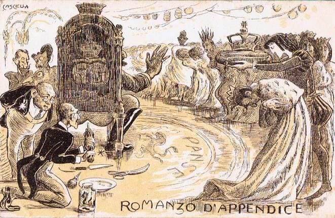 Nincs adat arról, melyik lehetett a legelső képeslapja, de a Romanzo d’Appendice (Tárcaregény) című különös, egész életművéből kilógó politikai gúnyrajz az elsők közé tartozhatott: